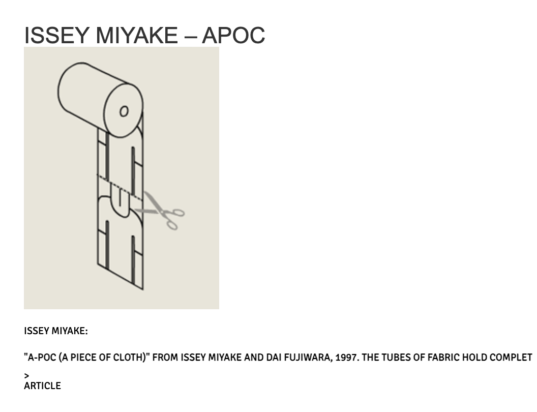A-POC는 일반적인 패션 제조 과정을 깨고, 특정한 패턴과 디자인을 지니지 않은 천을 롤로 제조하고, 이를 사용자가 원하는 형태로 자르고 만드는 것을 가능하게 하는 테크놀로지를 개발했습니다.