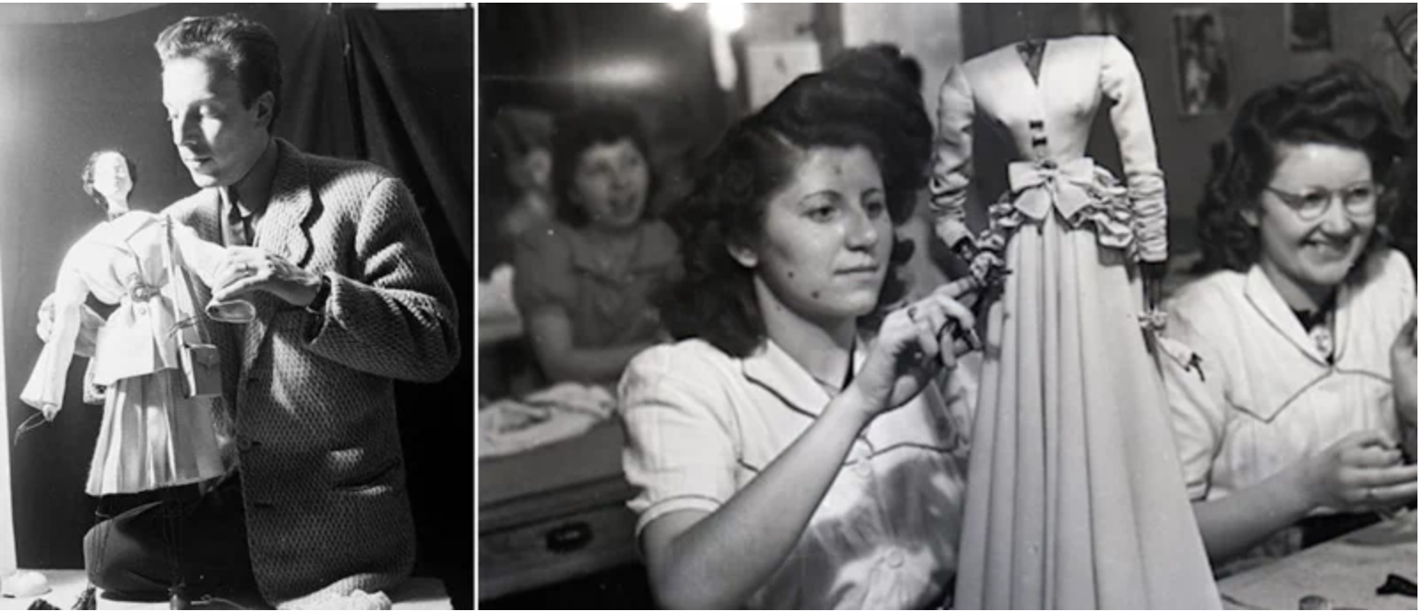 인형 모델에게 옷을 입히는 디자이너와 숙련공들